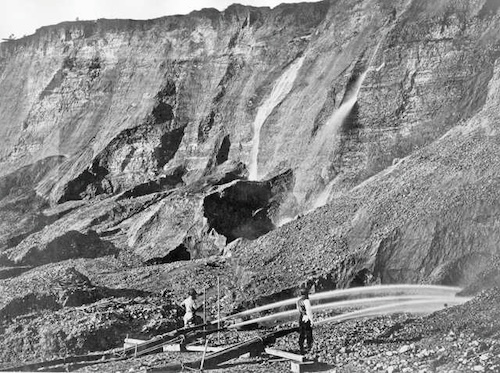 View of gold miners excavating an eroded bluff with jets of water at a placer mine in Dutch Flat, California, between 1857 and 1870. Original uploaded by Lordkinbote(Transfered by Nis Hoff), Wikimedia Common.