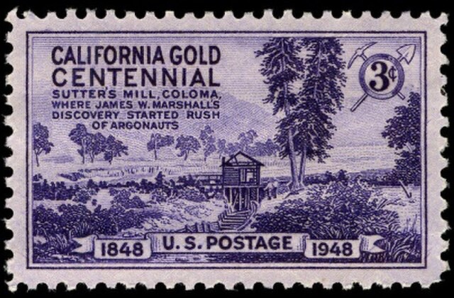 Source: A 3-cent stamp issued on January 24, 1948 commemorated the centennial of the discovery of gold in California. The stamp pictures Sutter’s Mill where the discovery started “the rush of Argonauts”, Bureau of Engraving and Printing