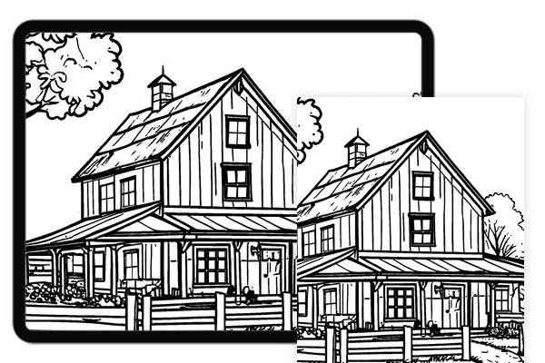 As you color this page, imagine life on a farm in a cozy farmhouse. Farmhouses are typically simple, functional homes built on agricultural land, often featuring a front porch and a gabled roof.