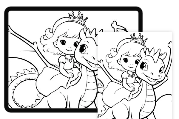 Discover the unexpected joys of friendship with this princess and her dragon pal! This coloring page features a princess befriending a friendly dragon with colorful scales and a kind expression. The p...