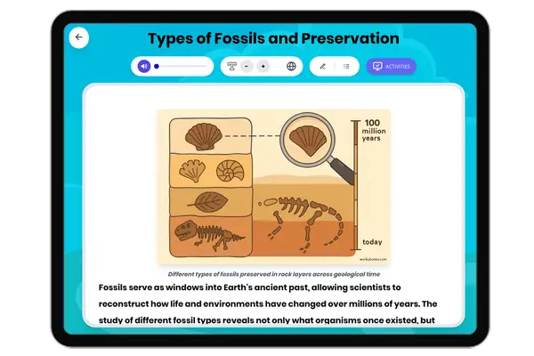 This middle school science passage explains the importance of fossils as preserved evidence of ancient life and their ro...