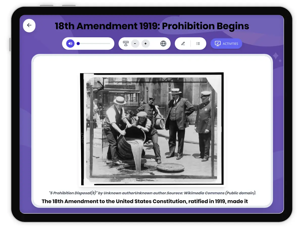This passage examines the 18th Amendment and the beginning of Prohibition in the United States. It explores how the amendment, passed in 1919 and enacted in 1920, prohibited the manufacture, sale, and transportation of alcoholic beverages. Students will learn about the motivations of reformers during the Progressive Era, the challenges of enforcement, and the rise of illegal activities as a result of the ban. The passage also discusses the societal divisions Prohibition created and how these contributed to its repeal in 1933 with the 21st Amendment. Designed to foster historical reasoning, the passage includes a glossary, a simplified version, Spanish translations, comprehension questions, writing prompts, and graphic organizers. Aligned to HSS 8.12.3 and CCSS.RI.6-8.1, RI.6-8.6, it supports both social studies and literacy development. Read aloud audio and differentiated versions are included.