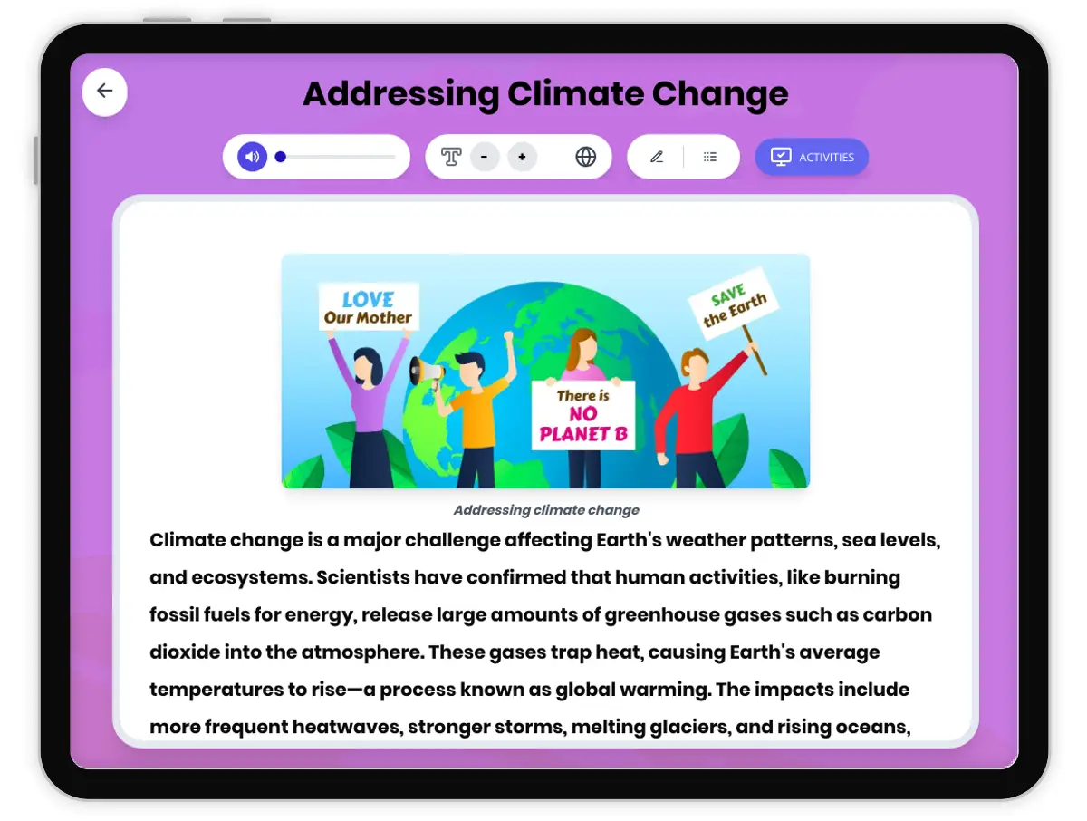This middle school science passage, aligned with NGSS standards MS-ESS3-4 and MS-ESS3-5, explores the mechanisms and solutions for addressing climate change. Students will learn how rising greenhouse gases impact Earth's systems and how mitigation strategies like renewable energy, energy efficiency, reforestation, and carbon capture work together with adaptation efforts and policy measures such as carbon pricing and international agreements. The passage integrates scientific thinking, cause-and-effect relationships, and real-world quantitative data, empowering students to understand both technological and individual actions for a more sustainable future. The resource includes Spanish translations, differentiated versions, glossary, quizzes, writing activities, and graphic organizers, with full audio integration for accessibility. This comprehensive approach helps students connect science to global society and their daily lives.