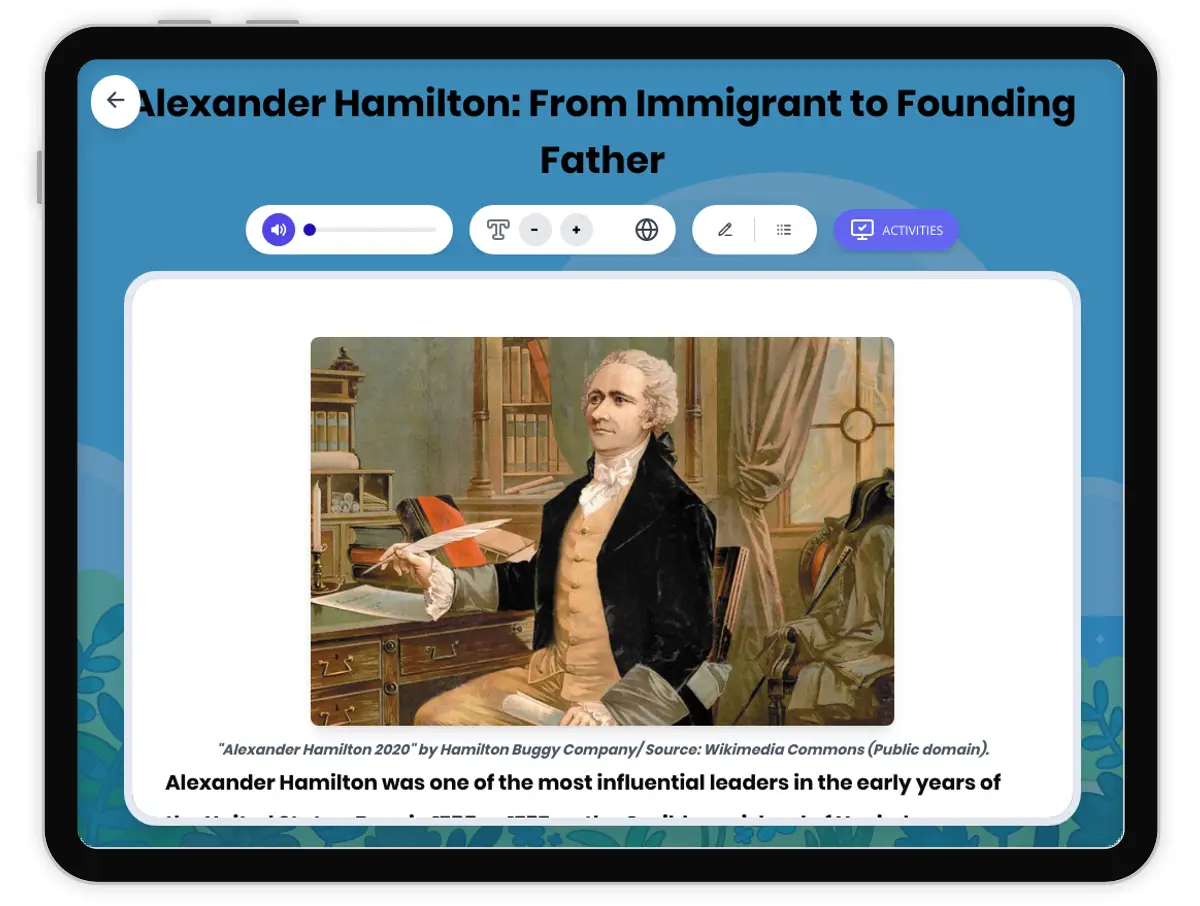 This passage explores the inspiring yet complex journey of Alexander Hamilton, tracing his rise from a Caribbean-born orphan to a crucial Founding Father of the United States. Students will analyze the historical context, challenges, and opportunities that shaped Hamilton's role in American independence and government. The text models historical reasoning, integrates academic vocabulary, and aligns with HSS 8.3.4 and CCSS RI.6-8.1, RI.6-8.6. Activities include a glossary, comprehension quiz, writing prompts, graphic organizers, and a timeline to deepen understanding. The passage is available with read aloud audio, Spanish translation, and a differentiated version for accessibility, making it ideal for developing historical literacy and critical thinking.