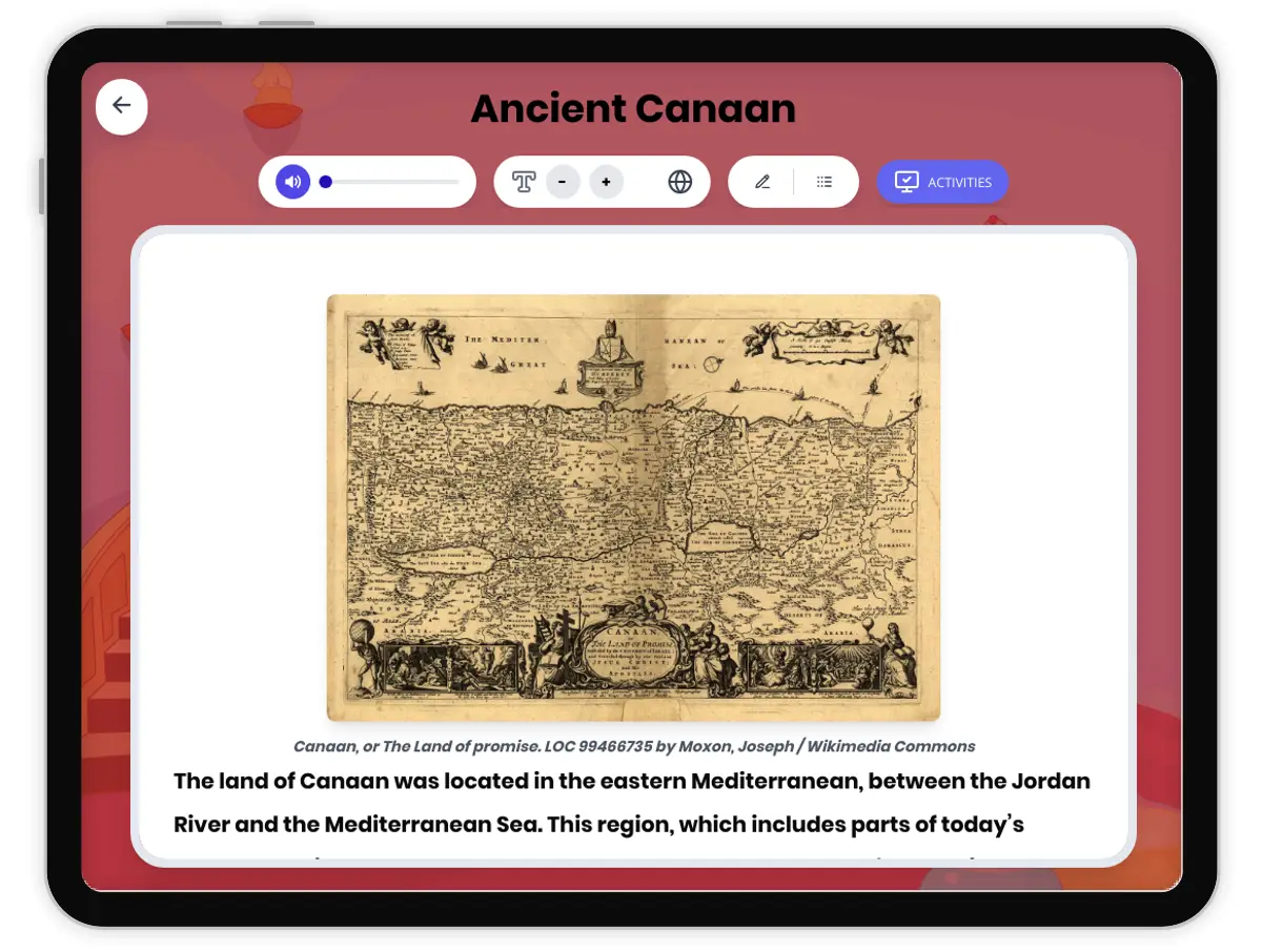 This educational passage explores the land of Canaan, the historical homeland of the ancient Israelites. Students will learn about the geography of Canaan, the migration and settlement of the Israelites, and the lasting impact of this region on world history. The passage includes specific archaeological and primary source evidence, such as the Merneptah Stele and ancient city ruins, and explains key concepts like covenant and monotheism. Activities include a multiple-choice quiz, writing prompts, glossary, and graphic organizers to help students analyze cause and effect and major developments over time. The resource also features a Spanish translation, a timeline, and is aligned with CA HSS 6.2 and CCSS RH.6-8.1 standards. Students are encouraged to think critically about how geography influenced civilization and how ancient events connect to broader historical themes.