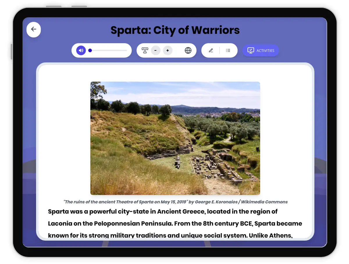 This reading passage explores the unique military society of Sparta, an influential city-state in Ancient Greece. Students will learn how geography, government, and culture shaped Sparta’s focus on discipline, warfare, and social structure. Using primary and archaeological evidence, the passage examines Spartan education, the role of helots, and the impact of the Lycurgan reforms. Activities include a multiple-choice quiz, writing prompts, graphic organizers, and a timeline to deepen historical understanding. The content aligns with California HSS 6.4 and CCSS RH.6-8.1 standards, making it ideal for developing critical reading and history skills. Features include a Spanish translation, read aloud audio, and vocabulary support to ensure accessibility. Keywords: Sparta, Ancient Greece, military society, city-state, helots, Lycurgus, Peloponnesian War, Greek history.