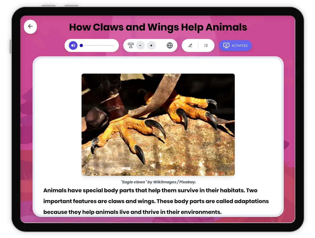 This Grade 4-5 science passage, 'How Claws and Wings Help Animals,' explores the fascinating ways that animal body parts help them survive in the wild. Students will learn about adaptations such as claws and wings, how these features help animals find food, escape predators, and live in different environments. The passage includes clear definitions of key terms like adaptation, predator, prey, and more, making it accessible for young readers. Real-world examples, such as eagles, cats, and bats, show how these adaptations work in nature. The resource is aligned with NGSS science standards and includes a glossary, comprehension questions, and writing prompts to reinforce understanding. Audio integration supports diverse learners. This engaging resource is perfect for classroom or home study and helps students make connections between science concepts and the animal world.
