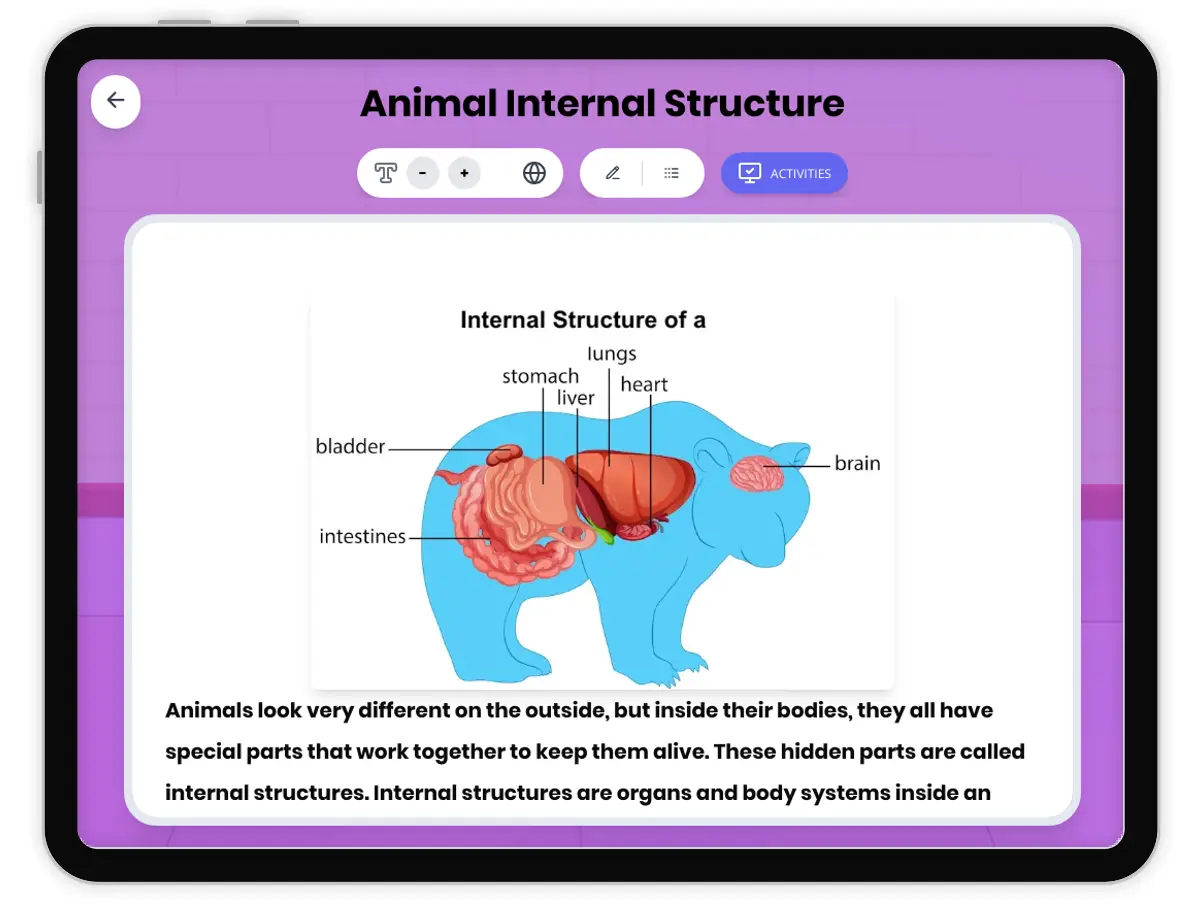 This engaging science passage for Grade 4-5 students explores animal internal structure and how organs work together to keep animals alive and healthy. Students learn about the circulatory system with the heart pumping blood, the respiratory system with lungs breathing air, the digestive system with the stomach breaking down food, and the nervous system with the brain controlling the body. The passage connects these concepts to students' own internal organs, helping them understand the hidden structures that keep them alive. Audio-integrated content supports diverse learners. Aligned with NGSS science standards 4-LS1-1, this passage includes vocabulary support, Spanish translation, differentiated text, comprehension questions, writing activities, and graphic organizers to help students describe how internal structures perform functions essential for animal survival.