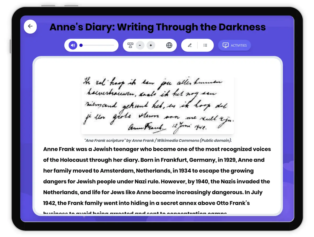 This passage explores the life of Anne Frank and the significance of her diary during World War II. Students will read about Anne's experiences hiding from the Nazis in Amsterdam, examine how her words became a powerful primary source, and analyze the impact of the Holocaust on individuals and society. The reading integrates disciplinary academic vocabulary, cause-and-effect relationships, and social context, supporting critical thinking and literacy skills. Students will also engage with multiple choice and writing activities, as well as graphic organizers to deepen their historical understanding. This history reading passage includes a read aloud audio and Spanish translation, and aligns with California History-Social Science Standard 7.11 and Common Core informational text standards.