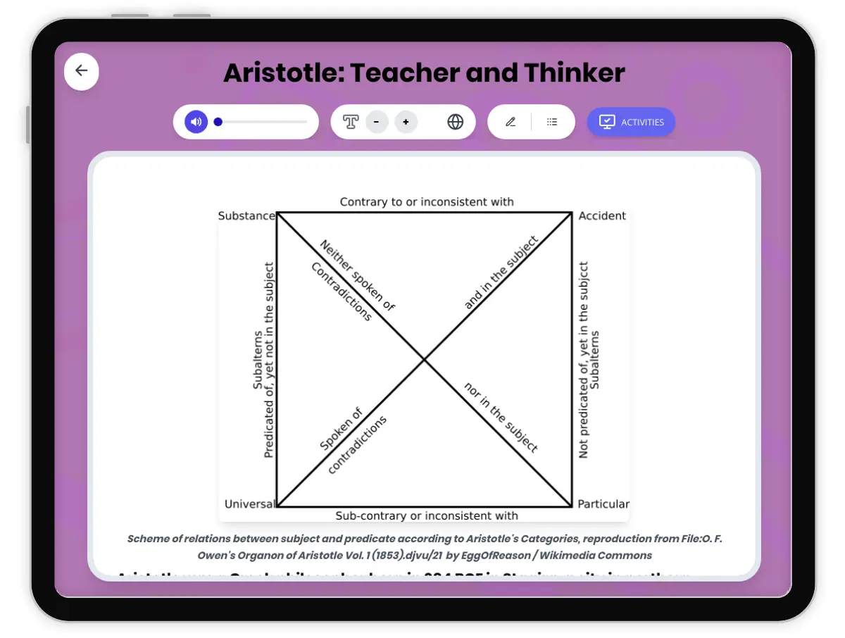 This engaging history reading passage explores the life and legacy of Aristotle, one of Ancient Greece's most influential philosophers. Students will learn how Aristotle shaped the fields of logic, science, and education, and how his teachings influenced Alexander the Great. The passage includes key vocabulary, primary source examples, and a clear explanation of Aristotle's role in the development of Western thought. Activities include a multiple-choice quiz, writing prompts, graphic organizers, and a timeline. The resource is aligned with CA HSS 6.4 and CCSS RH.6-8.2 standards. Audio read aloud and a full Spanish translation are provided, making this an accessible and rigorous resource for all learners.
