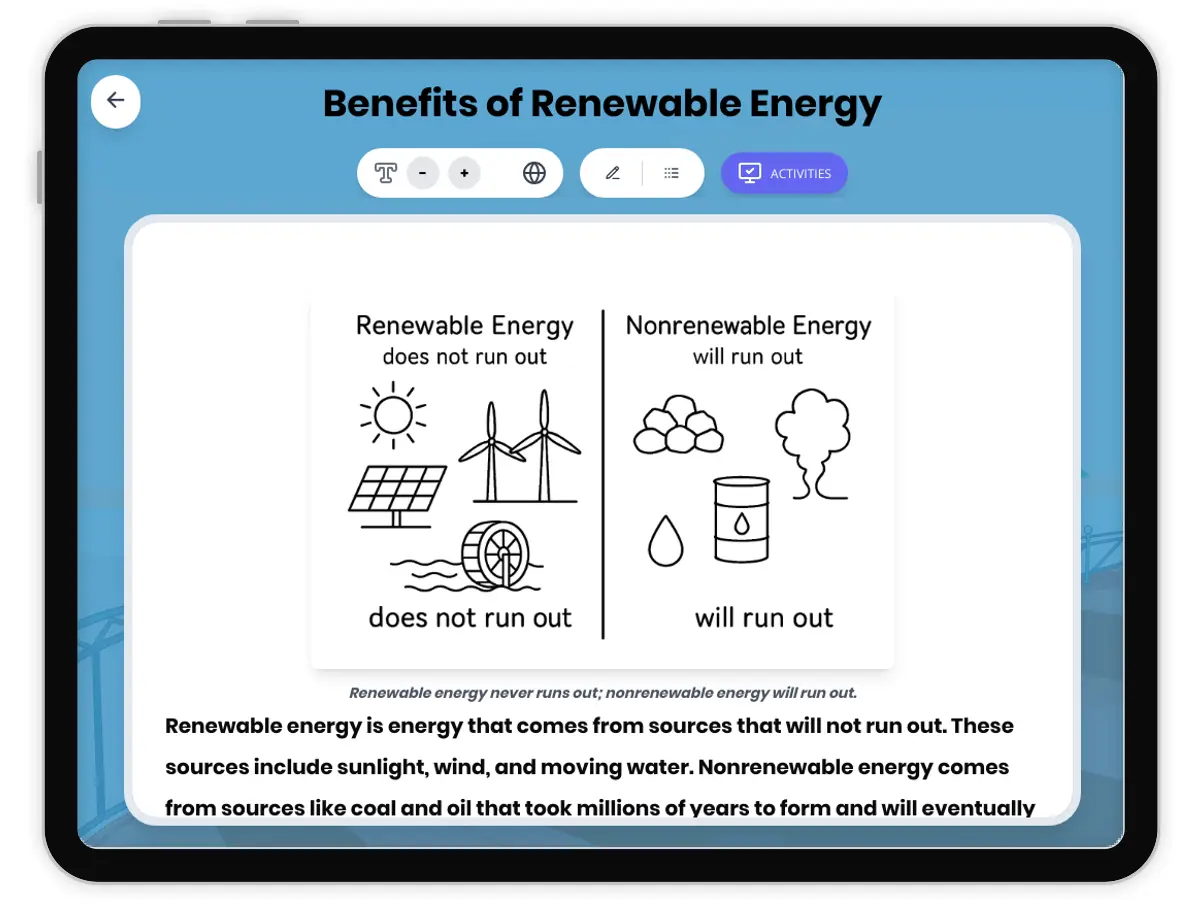 This 250-word reading passage introduces fourth-grade students to the benefits of renewable energy sources aligned with NGSS standard 4-ESS3-1. Students explore how renewable energy sources like solar power, wind energy, and water power differ from nonrenewable sources such as coal and oil. The passage emphasizes three key advantages: renewable sources do not run out, produce little or no pollution, and are available in many places. Through age-appropriate language and relatable examples, students build foundational understanding of energy resources and their availability. The passage includes audio integration to support diverse learners and features bolded vocabulary terms with immediate definitions. Accompanying activities include multiple-choice comprehension questions, writing prompts, and graphic organizers that help students compare renewable and nonrenewable energy sources. This resource supports hands-on investigations and classroom discussions about energy choices and resource management. Perfect for elementary science curriculum focusing on Earth's resources and human impact on the environment.