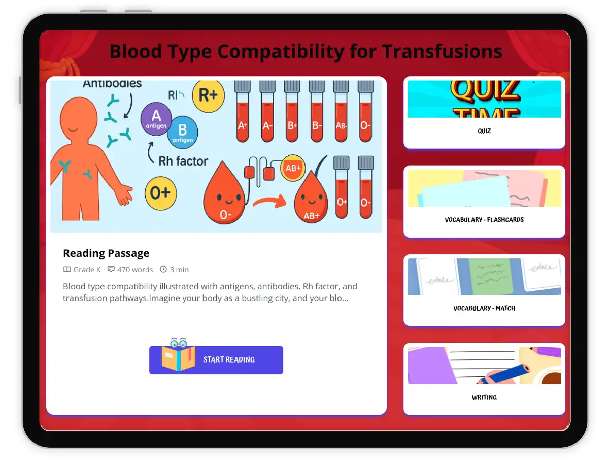 This engaging and audio-integrated reading passage, 'Blood Type Compatibility for Transfusions,' introduces sixth-grade students to the fascinating science behind blood types. It explains how the structure of cell surface molecules, called antigens, determines blood type and compatibility, directly aligning with NGSS LS1.A: Structure and Function. Students will learn about the different blood types (A, B, AB, O), the importance of matching blood types for safe blood transfusions, and the roles of antibodies. Key terms like 'antigens,' 'antibodies,' and 'transfusion' are defined in simple language, making complex biological concepts accessible. The passage also covers the concepts of universal donors and recipients, providing a foundational understanding of human biology and the critical role of blood donations in healthcare. This resource includes comprehension questions, a glossary, and short answer questions to reinforce learning.