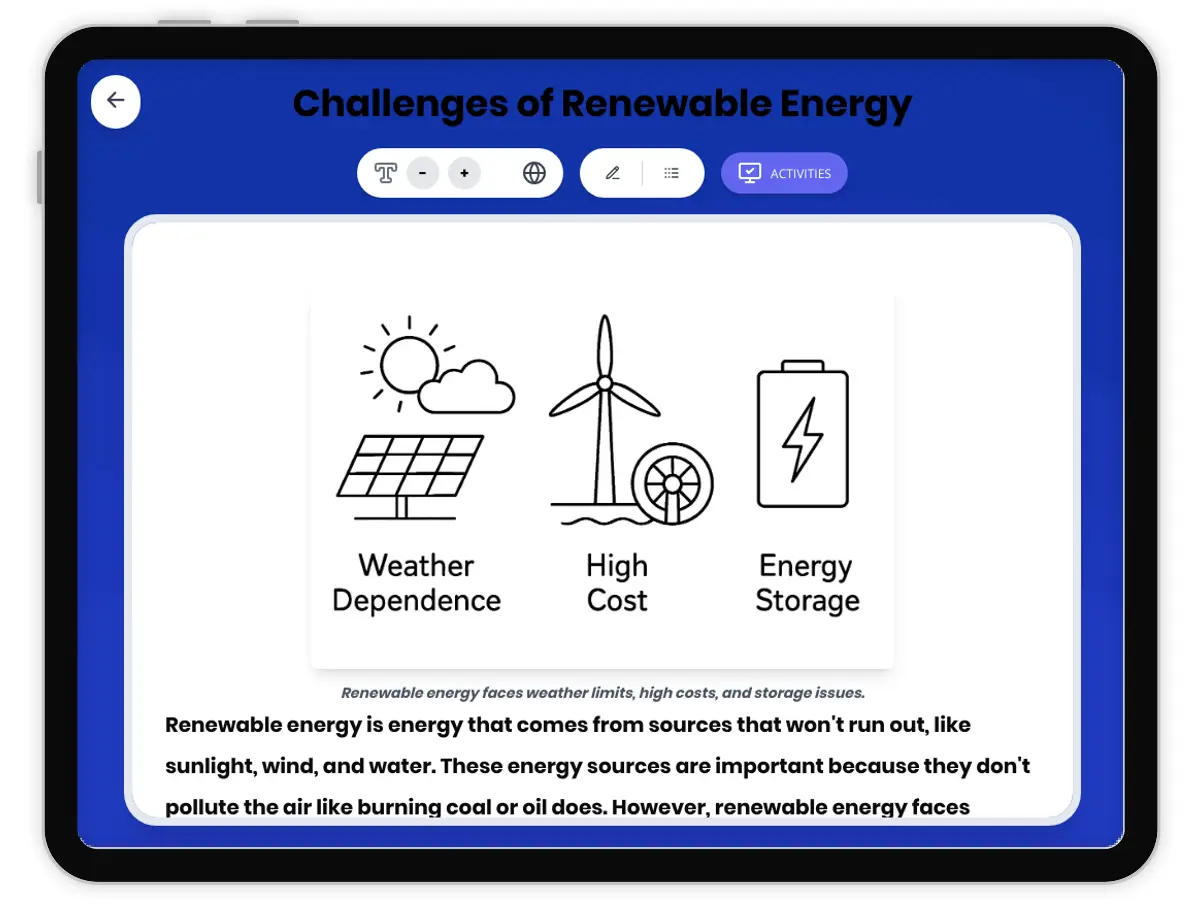 This 250-word reading passage introduces fourth-grade students to the challenges of renewable energy sources, aligned with NGSS standard 4-ESS3-1 (ESS3.A: Natural Resources). Students learn about renewable energy sources like solar and wind power and discover why these clean alternatives face practical challenges. The passage explains how weather conditions affect energy production, why location matters for renewable energy facilities, the high initial costs of setup, and timing issues when energy production doesn't match energy needs. Written at a Grade 4 reading level, this passage uses accessible language and real-world examples to help students understand that while renewable energy offers environmental benefits, it also presents challenges that scientists and engineers work to solve. The passage includes bolded vocabulary terms with immediate definitions and relatable analogies. Audio integration supports diverse learners. Accompanying activities include comprehension questions, writing prompts, and graphic organizers that help students analyze advantages and disadvantages of renewable energy and compare different energy sources. This resource builds foundational understanding of energy resources and prepares students for deeper investigation into sustainable solutions.