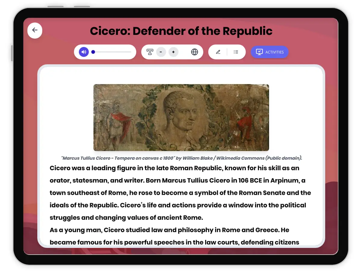 This engaging history reading passage explores the life and legacy of Cicero, one of ancient Rome’s most influential statesmen, orators, and authors. Students will learn about Cicero’s rise through the Roman political system, his defense of the Republic against corrupt leaders, and his lasting impact on government and law. The passage incorporates key academic vocabulary and primary source references to help students analyze cause and effect, social hierarchy, and the significance of Cicero’s actions in the broader context of Roman and world history. Activities include a multiple-choice quiz, writing prompts, and graphic organizers that encourage critical thinking. A Spanish translation and read aloud audio support diverse learners. This resource aligns with California HSS 6.7 and Common Core ELA RH.6-8.2 standards, making it ideal for classrooms studying ancient civilizations and the foundations of democratic government.