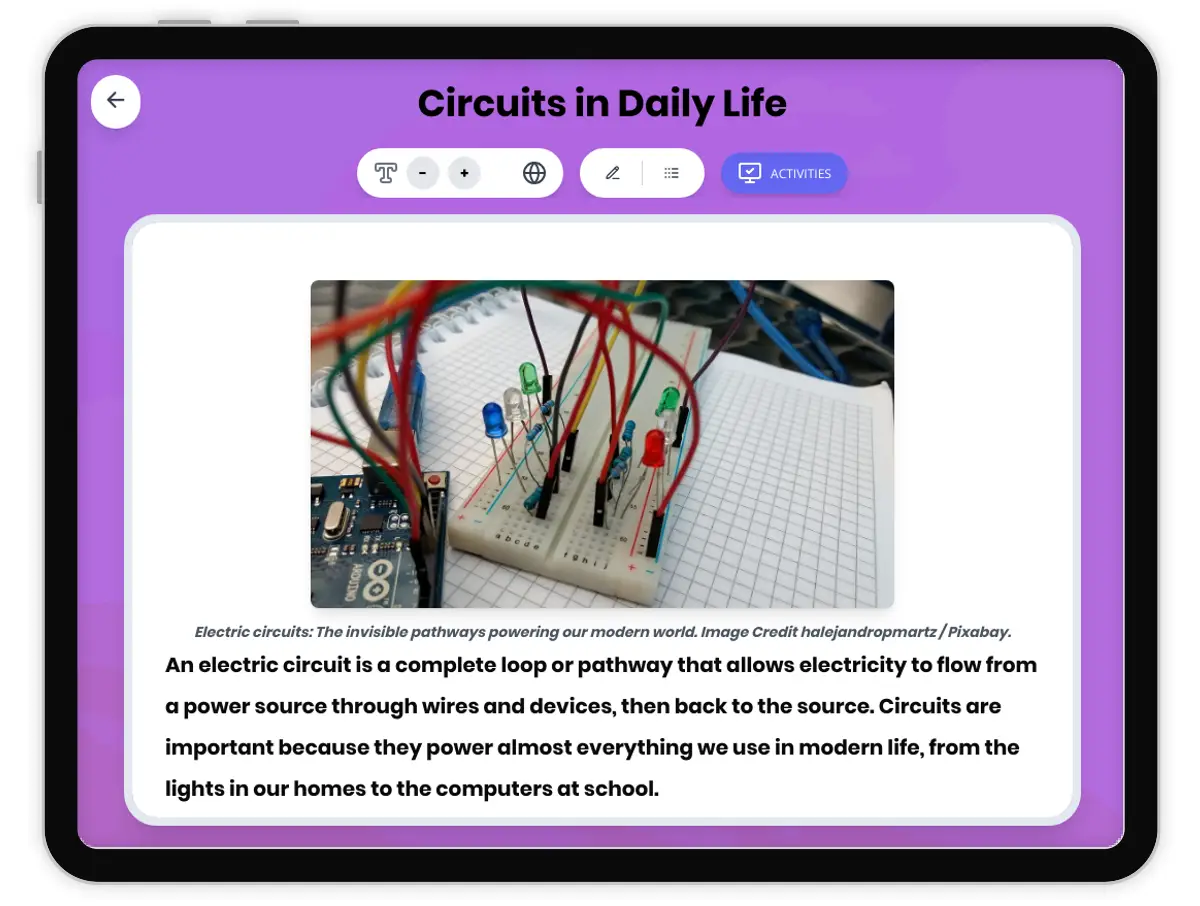 This engaging 250-word science passage introduces Grade 4-5 students to the concept of electric circuits in daily life. Aligned with NGSS standard 4-PS3-2, the passage explains how circuits are the hidden pathways that power everything from simple flashlights to complex computers and smartphones. Students learn about circuit components, how electricity flows through complete loops, and why understanding circuits helps us use electrical energy safely. The passage connects abstract concepts to concrete examples students encounter every day—light switches, remote controls, microwaves, and tablets. Through clear explanations and relatable analogies, students discover how dependent modern life is on electrical circuits and develop an appreciation for the technology around them. This audio-integrated resource includes a simplified differentiated version, Spanish translations, glossary terms, comprehension questions, writing activities, and graphic organizers. Perfect for teaching about energy transfer, electrical systems, and everyday technology, this passage helps students identify circuits in their homes, schools, and devices while building scientific literacy and critical thinking skills essential for understanding our electrically powered world.