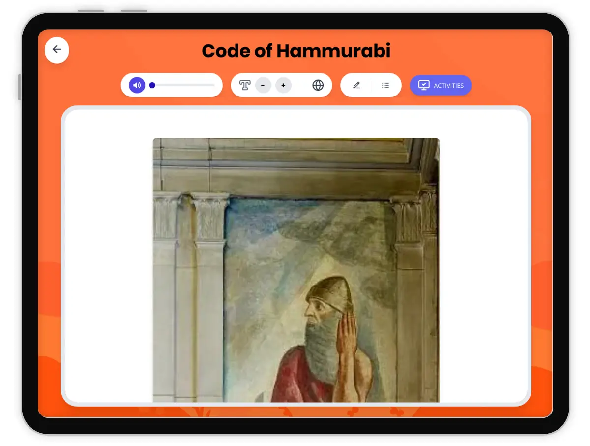 This rigorous history reading passage explores Hammurabi's Code, one of the earliest and most influential legal codes in human history. Students will learn how King Hammurabi established laws in ancient Mesopotamia to bring order to his expanding empire, the significance of the phrase 'an eye for an eye,' and how the Code reflected the social hierarchy of the time. The text includes references to primary sources, such as the stone stele engraved with cuneiform script, and discusses the impact of geography on lawmaking in Babylon. The passage is designed to align with CA HSS 6.2.3 (Students analyze the geographic, political, economic, religious, and social structures of the early civilizations of Mesopotamia) and CCSS RH.6-8.1 (Cite specific textual evidence). It includes a glossary, a Spanish translation, multiple-choice quiz, writing prompts, graphic organizers, and an audio read aloud option for accessibility.