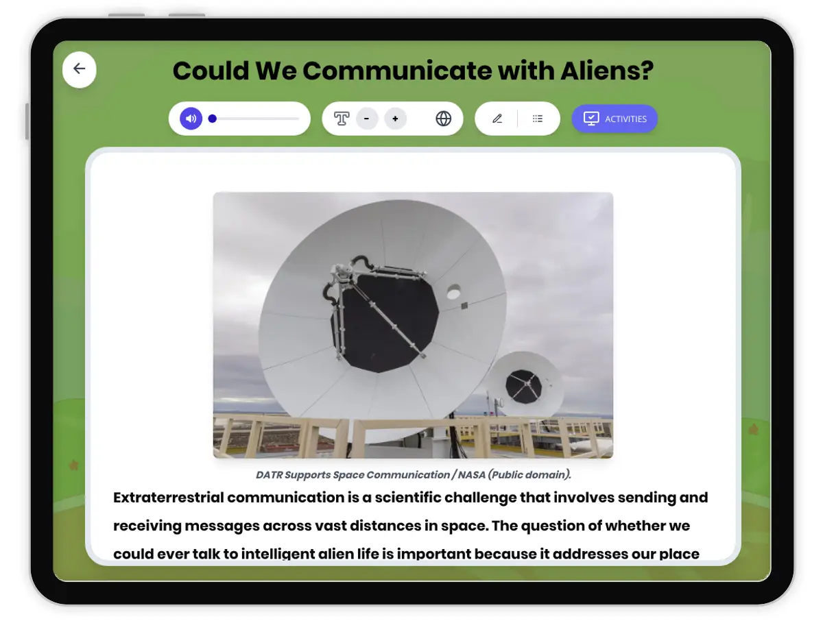 This middle school science passage, aligned with NGSS standard MS-ESS1-3, examines the scientific and technological challenges of communicating with alien life. Students will learn about the vast distances separating stars, the time it takes for messages to travel across space, and real-world efforts like the Arecibo message and Voyager Golden Records. The passage explains why mathematical concepts and prime numbers might be used for universal communication, explores the debate over whether humanity should intentionally announce itself to unknown civilizations, and discusses what alien life forms might be like from an evolutionary perspective. Activities include a glossary, reading comprehension quiz, writing prompts, and graphic organizers to deepen understanding. Designed for grades 6-8, this resource also includes Spanish translations and audio integration, supporting diverse learners and enhancing science literacy. Key concepts include the systems and interactions involved in interstellar communication and the profound impact that discovering even microbial extraterrestrial life could have on our understanding of the universe.