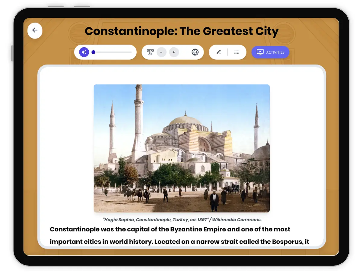 This engaging world history passage explores Constantinople’s role as the greatest city of the Middle Ages. Students will learn about the city’s legendary walls, the bustling trade routes that made it a commercial powerhouse, and the architectural wonder of Hagia Sophia. The passage highlights Constantinople’s significance as a cultural crossroads between Europe and Asia and discusses its impact on trade, religion, and society. Activities include a multiple-choice quiz, writing prompts, and graphic organizers that help students analyze cause and effect and chronology. Glossary terms support academic vocabulary, and Spanish translations are provided for both standard and simplified versions. This passage aligns with CA HSS 7.2.1 and CCSS RH.6-8.1, RH.6-8.2, making it ideal for history classrooms seeking rigorous, standards-based content with read aloud audio and Spanish translation.