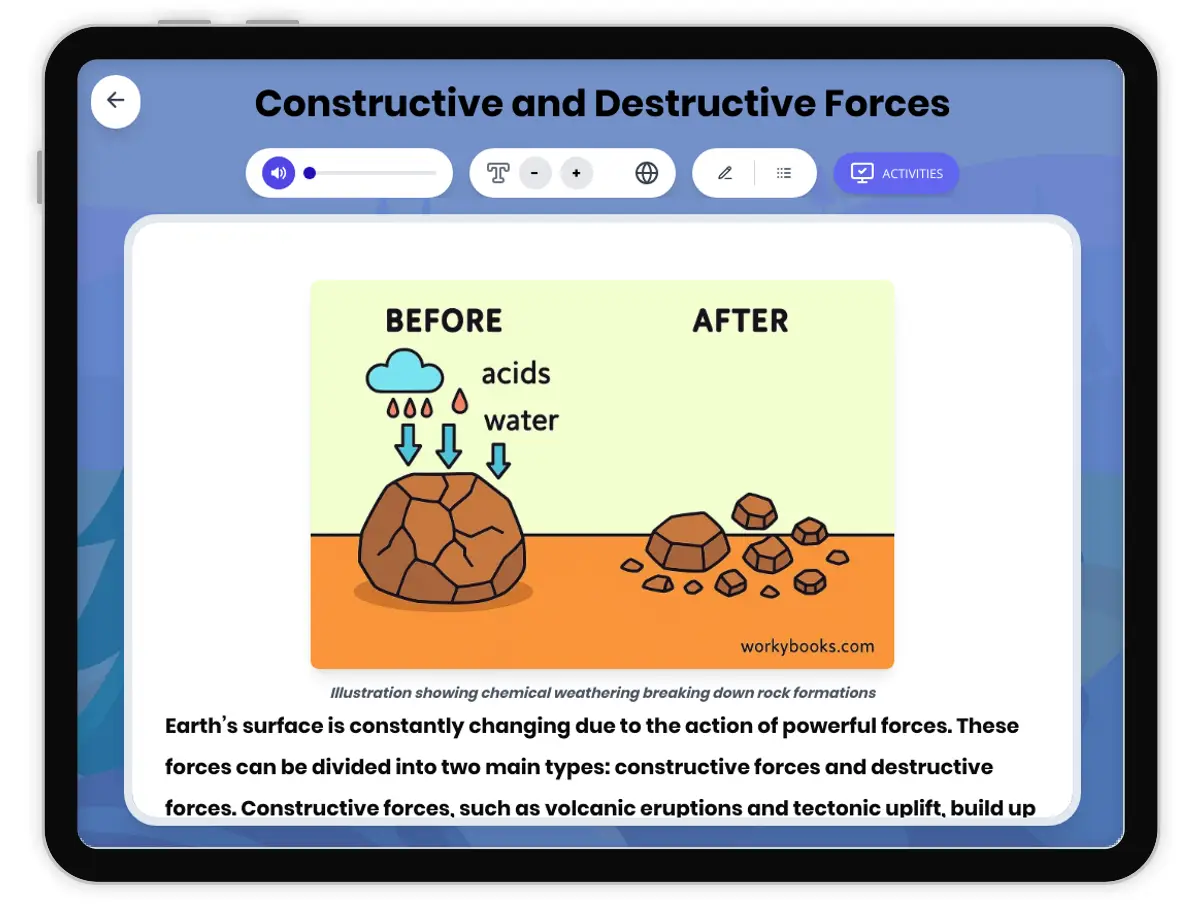 This middle school science passage explores how Earth's surface is constantly shaped by the interplay of constructive and destructive forces. Students learn about constructive forces such as volcanic eruptions, tectonic uplift, deposition, and coral reef growth, which build up land. Destructive forces, including weathering, erosion, and mass wasting, work to break down and wear away landforms. Real-world examples, like the rising Himalayas and formation of deltas, show how these processes operate over different time scales and interact to create dynamic landscapes. The passage aligns with NGSS standard MS-ESS2-1 and includes a glossary, Spanish translations, differentiated versions for struggling readers, and engaging activities such as quizzes, writing prompts, and graphic organizers. This resource is audio-integrated and is ideal for classroom or independent science learning. Keywords: constructive forces, destructive forces, erosion, deposition, mountain formation, weathering, NGSS MS-ESS2-1.