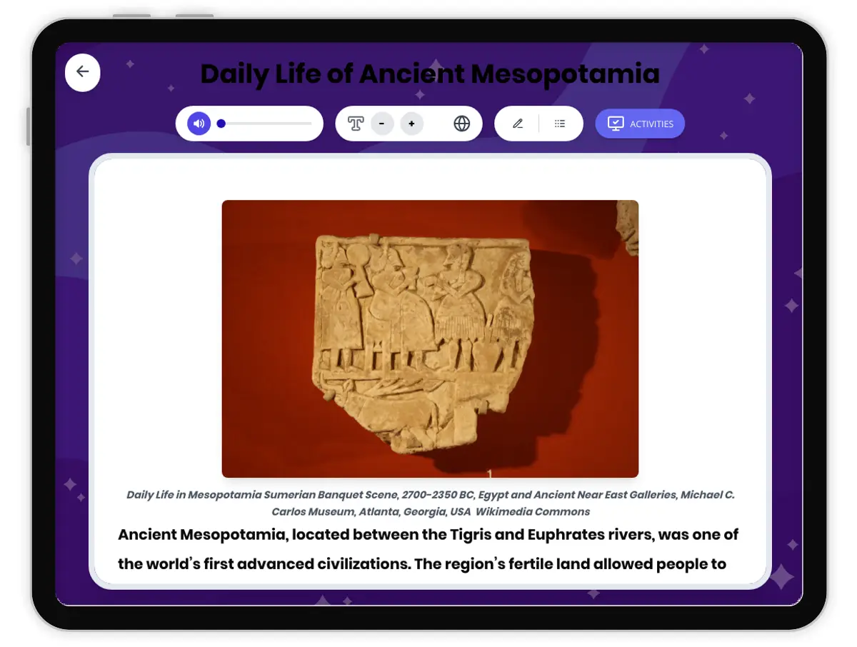 This engaging history reading passage explores daily life in ancient Mesopotamia, focusing on the social structure, roles of families, farmers, and slaves, and the impact of geography on society. Students will analyze how the Tigris and Euphrates rivers shaped agriculture, the importance of cuneiform writing, and the evidence from archaeological discoveries such as clay tablets and ziggurats. The passage provides a detailed look at social hierarchy, work, and the experiences of different groups, including women and enslaved people. Activities include a multiple-choice quiz, explanatory writing prompts, and graphic organizers that help students connect cause and effect, and understand historical evidence. Spanish translations, a glossary of key terms, and a relevant public domain image support accessibility. This lesson aligns with CA HSS 6.2 and CCSS RH.6-8.1 standards and includes read aloud audio for further support.