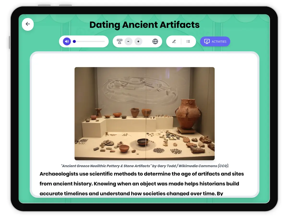This passage explores the scientific methods used by archaeologists to determine the age of artifacts, such as radiocarbon dating and stratigraphy. Students will learn how primary sources and scientific techniques help uncover the timeline of ancient civilizations. The text is aligned with CA HSS 6.1 and CCSS RH.6-8.1 standards, supporting critical thinking and text analysis. Activities include a quiz, writing prompts, graphic organizers, and a timeline. A Spanish translation and read aloud audio are provided for accessibility. Students will see how dating artifacts reveals human history and connects to broader themes of change over time, evidence, and historical significance. This resource is ideal for developing historical literacy and inquiry skills.