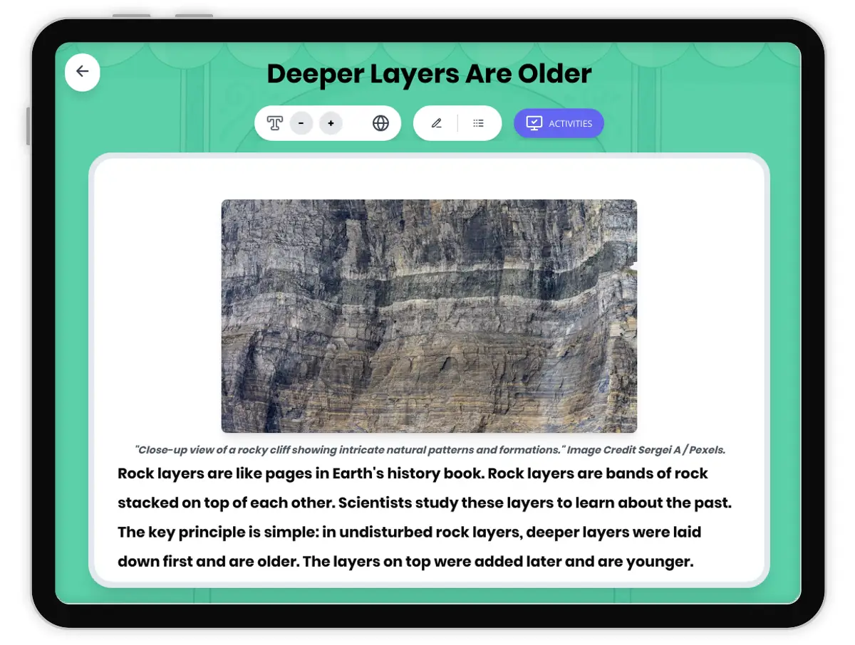 This engaging 250-word reading passage introduces fourth-grade students to the fundamental geological principle that deeper rock layers are older than layers above them. Aligned with NGSS standard 4-ESS1-1 (ESS1.C: The History of Planet Earth), the passage uses the familiar analogy of stacking pancakes to help students understand how rock layers form over time. Students learn how scientists determine the relative age of fossils and rocks by examining their position in rock layers, building foundational knowledge for understanding Earth's history. The passage explains key vocabulary terms including rock layers, fossils, and relative age in age-appropriate language. This audio-integrated resource includes a simplified differentiated version for struggling readers, complete Spanish translations of both passages, an engaging multiple-choice quiz testing recall and comprehension, three writing prompts requiring application of concepts, and two graphic organizers (Sequence/Process Table and Vocabulary in Context Table) to reinforce learning. Perfect for introducing earth science concepts, this standards-aligned passage provides scaffolded support for diverse learners while maintaining scientific accuracy. Teachers can use this resource for whole-class instruction, small group work, or independent reading to help students understand how geologists use rock layers to study Earth's past.