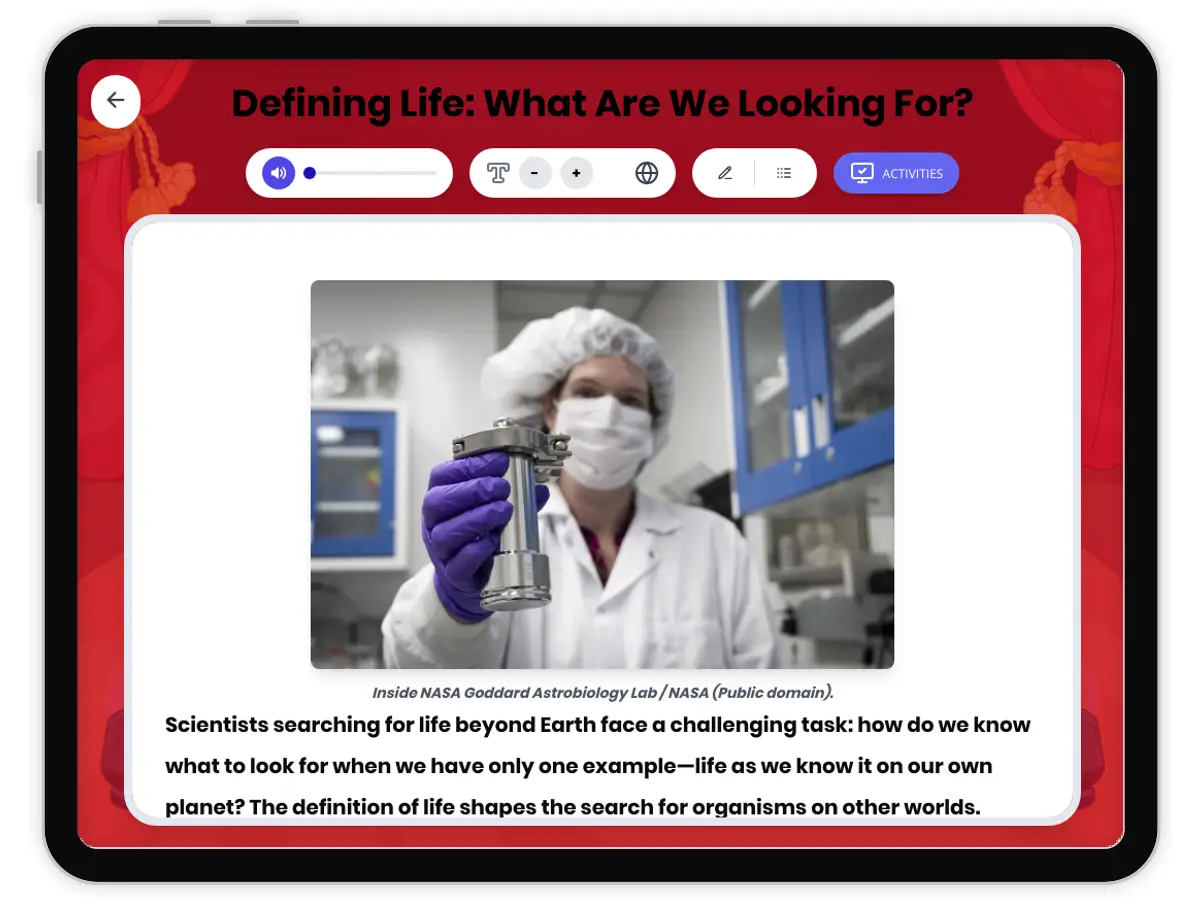 This informational science passage for middle school students explores the question: What is life, and how do we define it when searching for life beyond Earth? Aligned to NGSS standards MS-LS1-1 and MS-ESS1-2, the passage introduces the six key characteristics that define living things: organization (cells), metabolism, growth, reproduction, response to the environment, and evolution. It also explains why scientists use an Earth-centric definition—requiring water, carbon molecules, and energy sources—but encourages students to consider possibilities like silicon-based or ammonia-based life. Real-world examples such as extremophiles (life forms surviving in extreme environments) and tardigrades show how resilient life can be. The passage discusses challenges in defining life, like viruses and fire, and introduces the field of astrobiology. Activities include multiple-choice questions, writing prompts, and graphic organizers, all with audio integration for accessibility. This resource supports science literacy and critical thinking about life’s diversity and the search for extraterrestrial organisms.