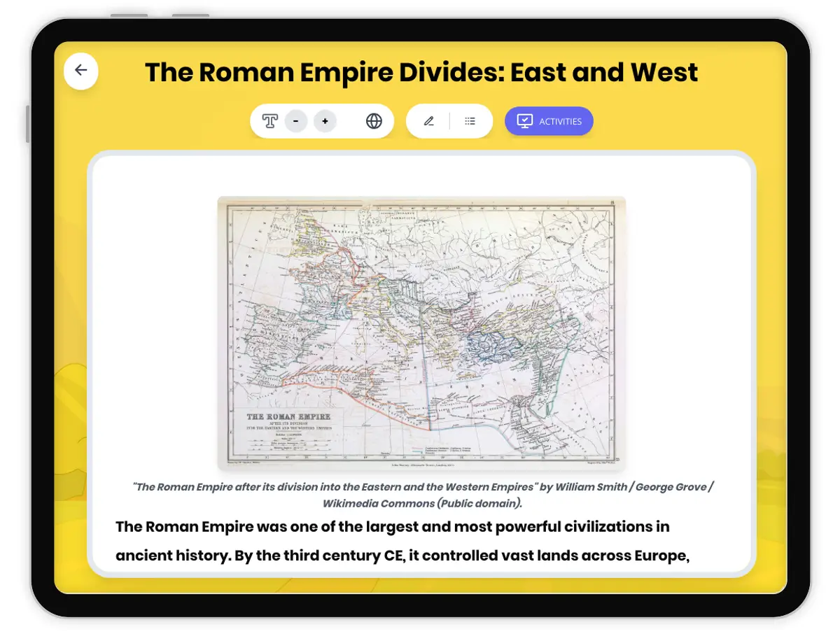 This engaging history reading passage explores the momentous division of the Roman Empire into Eastern and Western halves, examining its causes, major events, and lasting consequences. Students will learn about Emperor Diocletian's reforms, the founding of Constantinople, and the rise of the Byzantine Empire, while considering the geographic, political, and social factors involved. The passage provides key vocabulary, a glossary, and a timeline to support comprehension. Multiple-choice and writing activities encourage deep analysis of cause-and-effect relationships and historical significance. Aligned with standards 6.7 and RH.6-8.2, this resource also includes a Spanish translation and read aloud audio, making it accessible for diverse learners. Ideal for developing critical thinking and historical literacy skills.