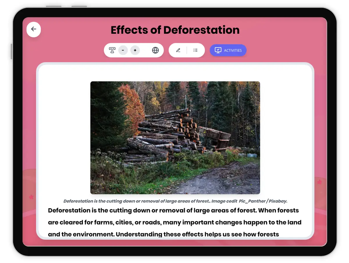 This comprehensive Grade 5 science reading passage explores the effects of deforestation and its impact on multiple Earth systems. Aligned with NGSS standard 5-ESS3-1, students discover how cutting down large areas of forest leads to soil erosion, loss of animal habitats, decreased oxygen production, and changes to local water and weather patterns. The passage uses age-appropriate language to explain complex environmental connections, helping students understand how vegetation and land interact within Earth's systems. Audio-integrated content supports diverse learners through multi-sensory engagement. The lesson includes a simplified differentiated version for struggling readers, Spanish translations for ELL students, vocabulary glossary, multiple-choice comprehension questions, writing activities, and graphic organizers. Students explore cause-and-effect relationships in forest ecosystems and learn why forests matter for soil stability, wildlife survival, air quality, and climate regulation. This resource provides foundational knowledge for hands-on investigations and classroom discussions about human impact on the environment and the importance of forest conservation.