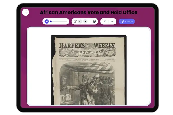 This reading passage explores the experiences of enslaved people who escaped to Union lines during the American Civil War. It examines their motivations, the risks they faced, and the crucial contributions they made to the Union cause. The passage addresses concepts such as self-emancipation and contraband, and explains the complex choices faced by both the Union and the enslaved individuals. Students will engage with key academic vocabulary, analyze cause and effect, and practice historical reasoning. This resource aligns with HSS 8.10.6 and CCSS.RI.6-8.1, RI.6-8.6 standards. Included are differentiated reading versions, a Spanish translation, glossary, comprehension quiz, writing prompts, graphic organizers, and a timeline. Audio read-aloud and activities support diverse learners. This is a complete U.S. History reading lesson suitable for classrooms and independent study.