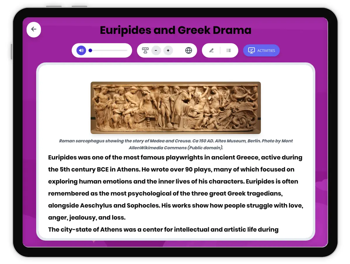This engaging passage introduces students to Euripides, one of the greatest ancient Greek playwrights, known for his exploration of human emotions and psychological drama. Students will discover how Euripides transformed Greek theater by focusing on realistic characters and complex feelings, using specific examples from his plays and ancient sources. The passage highlights the historical context of 5th century BCE Athens, the significance of theater in Greek society, and Euripides’ lasting impact on literature and drama. Activities include comprehension questions, writing prompts, and graphic organizers to deepen historical thinking. This history reading passage comes with read aloud audio and a full Spanish translation, and aligns with CA HSS 6.4.4, 6.4.7 and CCSS RI.6-8.1, RI.6-8.2, W.6-8.2. Perfect for integrating ancient history and ELA standards in the classroom.