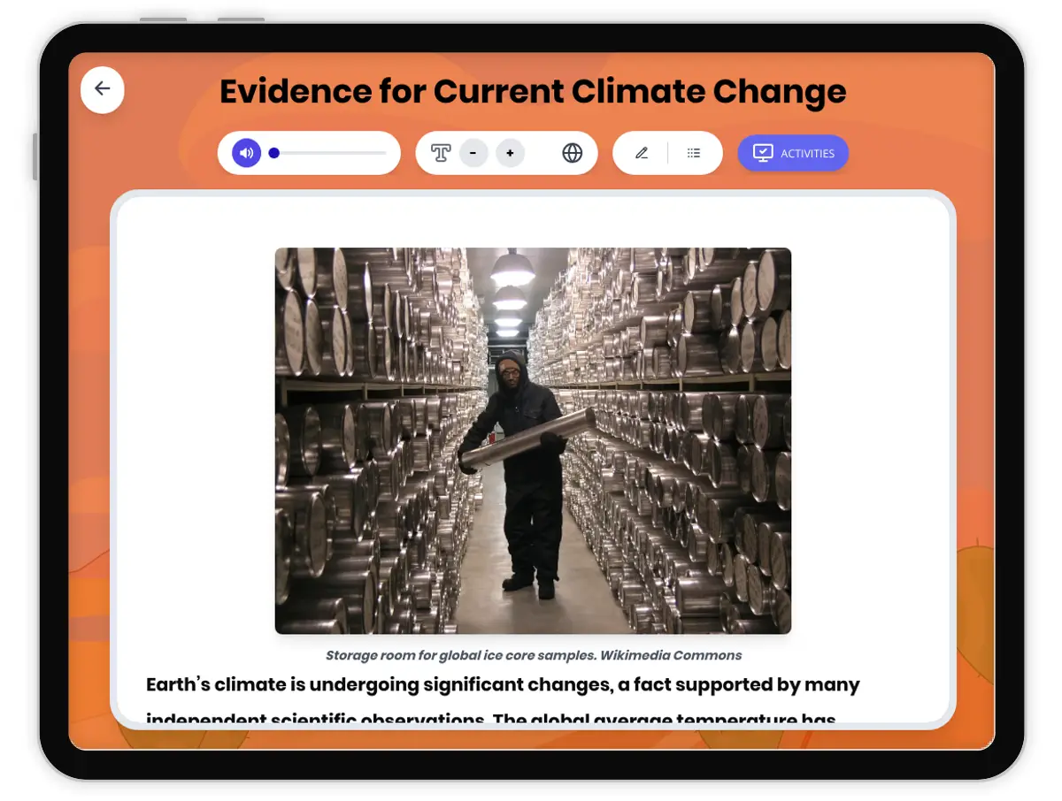 This middle school science reading passage introduces students to the multiple lines of evidence scientists use to identify current climate change. Aligned to NGSS MS-ESS3-5, the passage explores temperature records, ice core CO₂ data, sea level rise, glacier and Arctic ice loss, ocean warming, and changes in the timing of biological events (phenology). Students gain insight into how different types of scientific observations and measurements work together to show that Earth’s climate is changing, with emphasis on underlying mechanisms, cause-and-effect relationships, and the importance of using independent data sources. The resource includes a differentiated version, Spanish translations, glossary, comprehension questions, writing prompts, and graphic organizers to support all learners. Audio integration enhances accessibility, making it ideal for diverse classrooms.