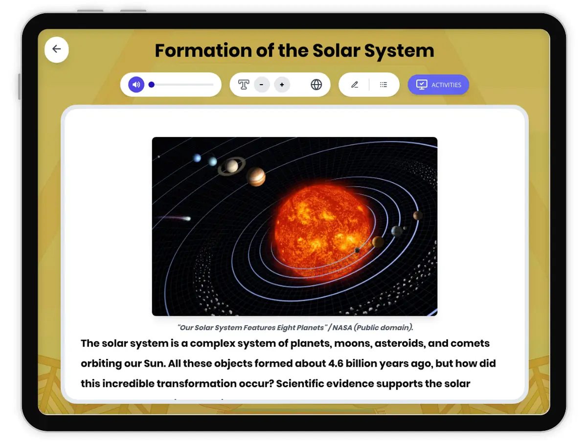 This comprehensive middle school science passage explores the formation of the solar system, aligned to NGSS standard MS-ESS1-2. Students learn how the solar nebula theory explains the transformation of a giant cloud of gas and dust into our Sun, planets, asteroids, and comets. The text highlights cause-and-effect chains, such as gravity's role in the collapse and spinning of the nebula and how temperature differences led to rocky and gas planets. Students examine real scientific evidence, including the direction of planetary orbits and observations of other star systems. The passage features an academic vocabulary glossary, Spanish translation, a simplified version, multiple choice quiz, writing prompts, and interactive graphic organizers. Audio integration supports diverse learners. This resource is ideal for middle school classrooms seeking standards-based, engaging science content about planetary system formation.