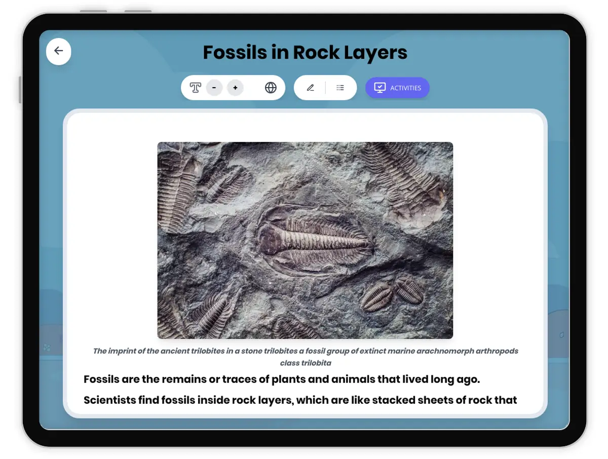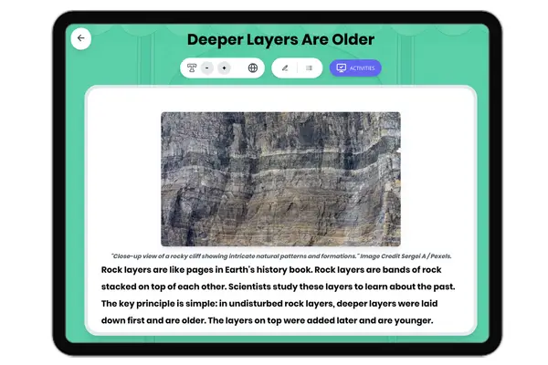 This 250-word reading passage introduces fourth-grade students to the concept of fossils in rock layers, aligned with NGSS standard 4-ESS1-1 and the Disciplinary Core Idea ESS1.C: The History of Planet Earth. Students discover how fossils are preserved in specific rock layers and learn that the position of a fossil layer indicates when that organism lived. The passage explains that deeper layers contain older fossils of simpler organisms, while higher layers reveal younger fossils of more complex life forms. Using the analogy of a history book with pages and illustrations, students understand how scientists read Earth's story through rock layers. The passage includes audio integration for accessibility and engagement. This foundational knowledge prepares students for hands-on investigations and discussions about Earth's history and the evolution of life over time. Key vocabulary terms including fossils, rock layers, organisms, and sedimentary rocks are introduced and defined in context. The passage avoids overwhelming students with complex terminology while building essential background knowledge needed for deeper NGSS-aligned learning experiences in earth science and paleontology.