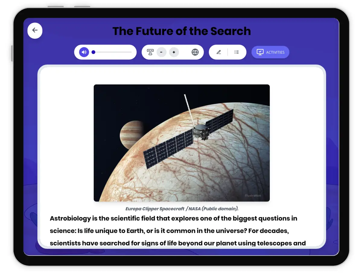 This informational passage for grades 6-8 explores how scientists are using cutting-edge missions and technology to search for life beyond Earth. Students will learn about the James Webb Space Telescope’s ability to analyze exoplanet atmospheres, the Europa Clipper’s study of Jupiter’s icy moon, NASA’s Dragonfly drone on Titan, Mars Sample Return, SETI, Breakthrough Listen, and more. The passage explains the scientific mechanisms and goals behind these projects and connects them to the Next Generation Science Standards (MS-ESS1-3, MS-ETS1-1). Key vocabulary is embedded with contextual definitions, and comprehension is supported by a glossary, Spanish translations, differentiated text, and multiple graphic organizers. Audio integration and writing prompts help students synthesize information and explore cause-and-effect relationships in the search for life. Ideal for middle school science classrooms focusing on planetary systems, engineering design, and astrobiology.