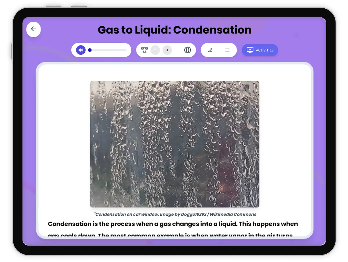 This engaging science passage for Grades 4-5 introduces students to the concept of condensation, the process where a gas turns into a liquid. Aligned with NGSS standards, the passage explains key scientific vocabulary like evaporation, condensation, and dew point in simple terms, with real-world examples such as dew on grass and water droplets on cold drinks. Students will learn about the water cycle and how condensation is important for weather and daily life. The resource includes a glossary of key terms, a Spanish translation of the passage, reading comprehension questions, and writing prompts to promote critical thinking and application. Audio integration is available to support diverse learners. This resource is ideal for classroom or at-home science learning and supports NGSS standards for understanding states of matter.