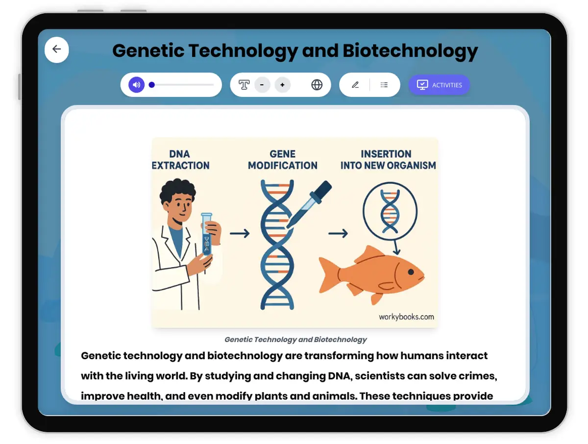 This comprehensive middle school science passage introduces students to the world of genetic technology and biotechnology, aligning with NGSS standard MS-LS3-1. Students will learn how scientists use DNA fingerprinting for forensics and paternity testing, genetic testing to screen for inherited diseases, and gene therapy to replace faulty genes. The passage also explains the processes behind genetic engineering of GMOs, the method of cloning, and the revolutionary gene editing tool CRISPR. Real-world applications, ethical debates, and career opportunities are highlighted, fostering scientific thinking and systems understanding. Integrated audio support aids diverse learners. Vocabulary terms are defined, and students practice comprehension and higher-order analysis through multiple-choice and writing activities. Graphic organizers help visualize key ideas and cause-and-effect relationships, making complex biotechnology concepts accessible and relevant to grades 6-8.