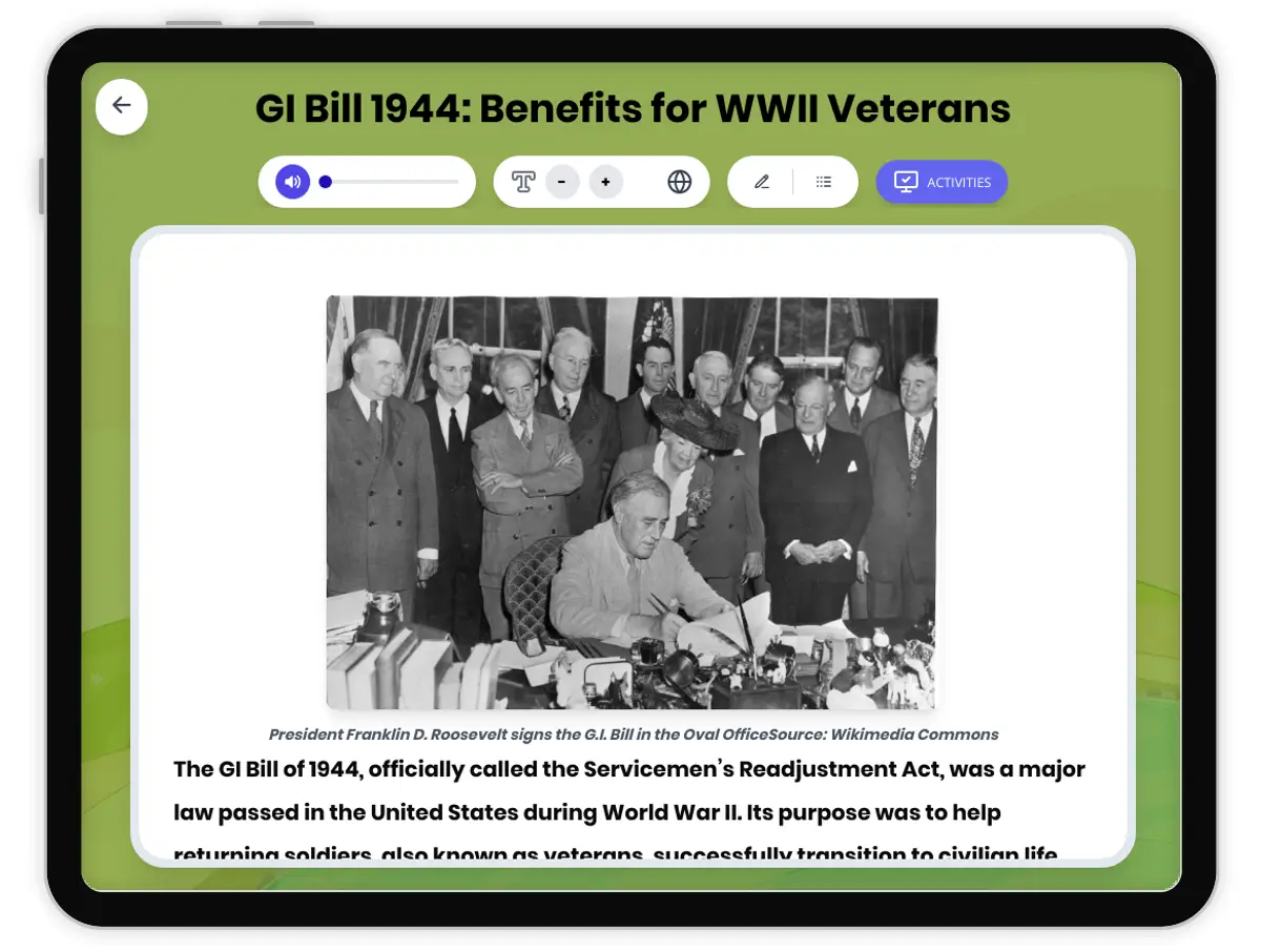 This reading passage explores the GI Bill of 1944 and its transformative impact on World War II veterans and American society. Students will analyze the causes behind the GI Bill’s creation, the multiple perspectives involved, and the complex consequences for education, housing, and the economy. The text encourages critical thinking by highlighting both the opportunities and challenges that arose from the policy, including issues of fairness and access. The passage integrates a primary source excerpt and features a glossary of academic vocabulary to support comprehension. Aligned to C3 Framework and Common Core standards, this resource includes a timeline, quiz, writing prompts, and a graphic organizer to engage students in historical reasoning. A Spanish translation and read aloud audio are provided for accessibility. This passage is ideal for deepening understanding of postwar America, government policy, and civic rights.
