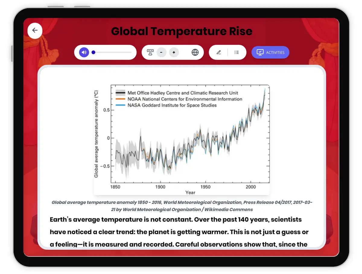 This middle school science reading passage introduces students to the science of temperature records and how direct measurements have revealed global warming trends since the late 1800s. Aligned with NGSS standard MS-ESS3-5, the passage explains the mechanisms behind temperature measurement, the use of thermometers, satellites, ships, and buoys, and the significance of the data they collect. Students will understand that Earth's global average temperature has risen by about 1.1°C (2°F) since pre-industrial times, with most of the warming occurring since 1980. The passage explores why the oceans absorb most of this excess heat, how scientists account for the urban heat island effect, and why multiple independent datasets reinforce the same warming trend. Activities include comprehension questions, vocabulary, writing prompts, and graphic organizers to deepen understanding. Audio integration supports diverse learners. This resource is ideal for grades 6-8 science classes examining human impact on Earth's systems.