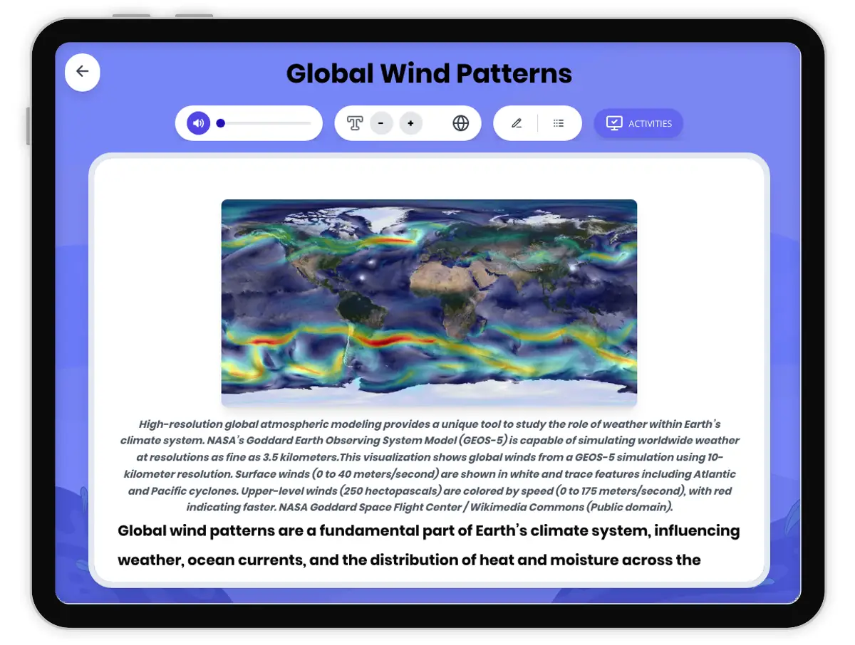 This comprehensive passage introduces middle school students to global wind patterns and atmospheric circulation, aligning with NGSS MS-ESS2-6. Students will explore how uneven heating of Earth’s surface creates convection cells, resulting in major wind belts and influencing weather around the globe. The passage covers the mechanisms of Hadley, Ferrel, and Polar cells, discusses surface winds like the trade winds and westerlies, and introduces jet streams. It promotes scientific thinking by explaining how observations and data have shaped our understanding of global wind systems. The resource includes a glossary, differentiated versions for struggling readers, multiple-choice and writing activities, and graphic organizers to support comprehension. Audio integration enhances accessibility for diverse learners. This passage is ideal for building foundational knowledge of Earth’s atmospheric processes and their impact on climate, ecosystems, and human society.