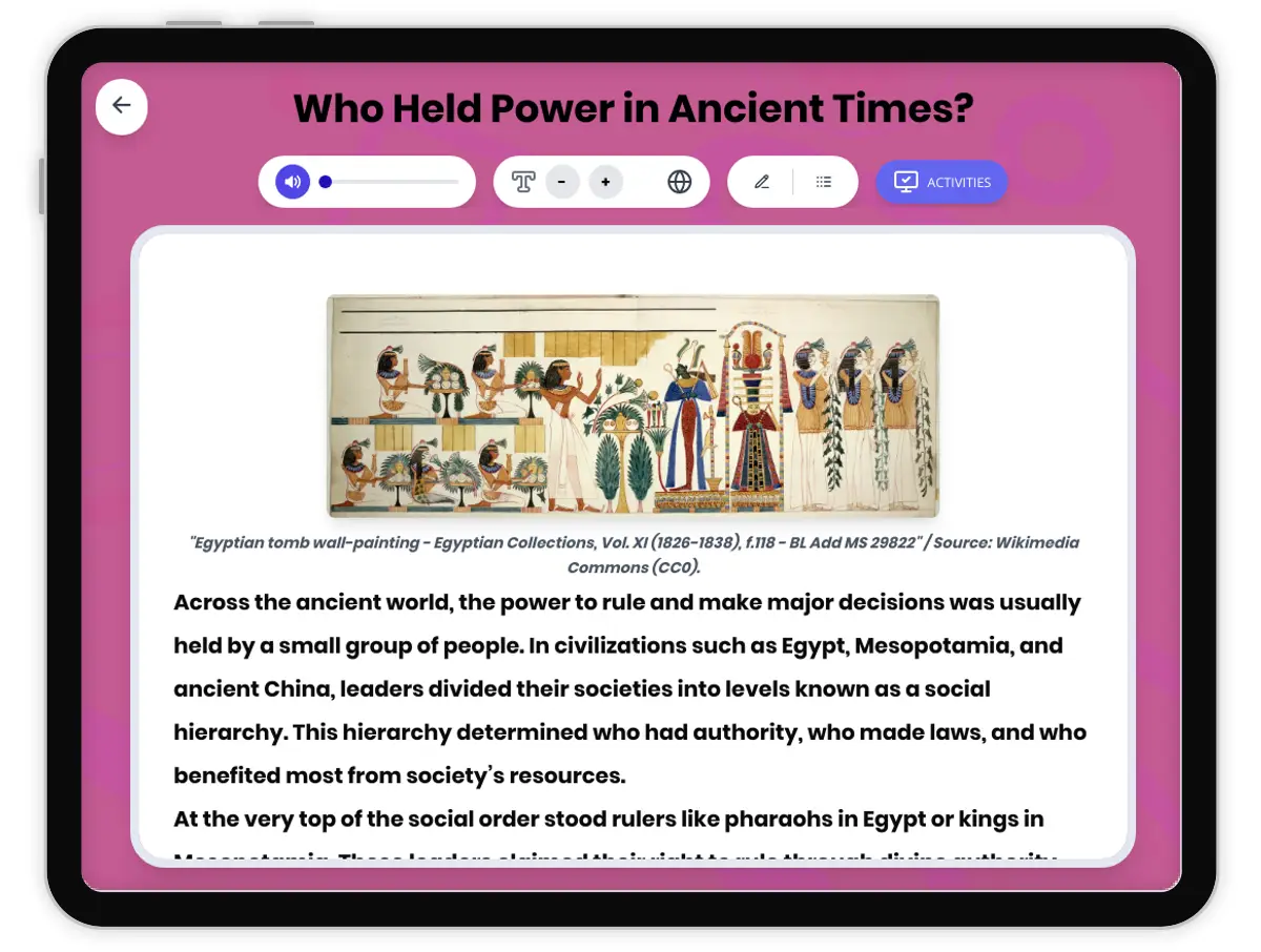 This engaging history reading passage explores the question: Who held power in ancient times? Students will discover how power was distributed among nobles, priests, officials, and warriors in ancient civilizations such as Egypt, Mesopotamia, and China. The passage uses archaeological and primary sources to illustrate the roles of these groups and how their influence shaped society and governance. Key vocabulary is integrated and explained for academic rigor. Activities include a quiz, writing prompts, two graphic organizers, and a timeline. The passage is aligned with standards 6.1, 6.2, and RH.6-8.1. A Spanish translation and read aloud audio are provided to support diverse learners. Students will analyze the impact of power structures on daily life and continuity and change over time, strengthening both historical thinking and reading comprehension skills.