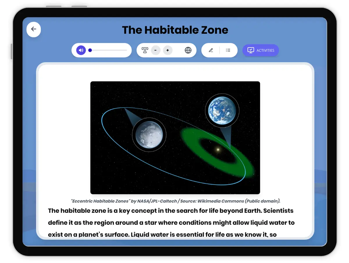 This comprehensive passage introduces middle school students (grades 6-8) to the concept of the habitable zone, also known as the 'Goldilocks zone.' Aligned to NGSS MS-ESS1-2, it explains the scientific reasoning behind where life might exist in the universe. Students will learn how star brightness, planetary atmosphere, and other factors determine whether a planet can support liquid water, a key ingredient for life. The passage also discusses how planets like Earth, Venus, and Mars compare, and explores the potential for life on moons outside the traditional habitable zone, like Europa and Enceladus. Glossary terms, a simplified differentiated version, Spanish translations, quizzes, writing prompts, and graphic organizers support diverse learners. Audio integration is available for all content. This resource is ideal for teachers seeking to deepen student understanding of planetary systems, habitability, and astrobiology.