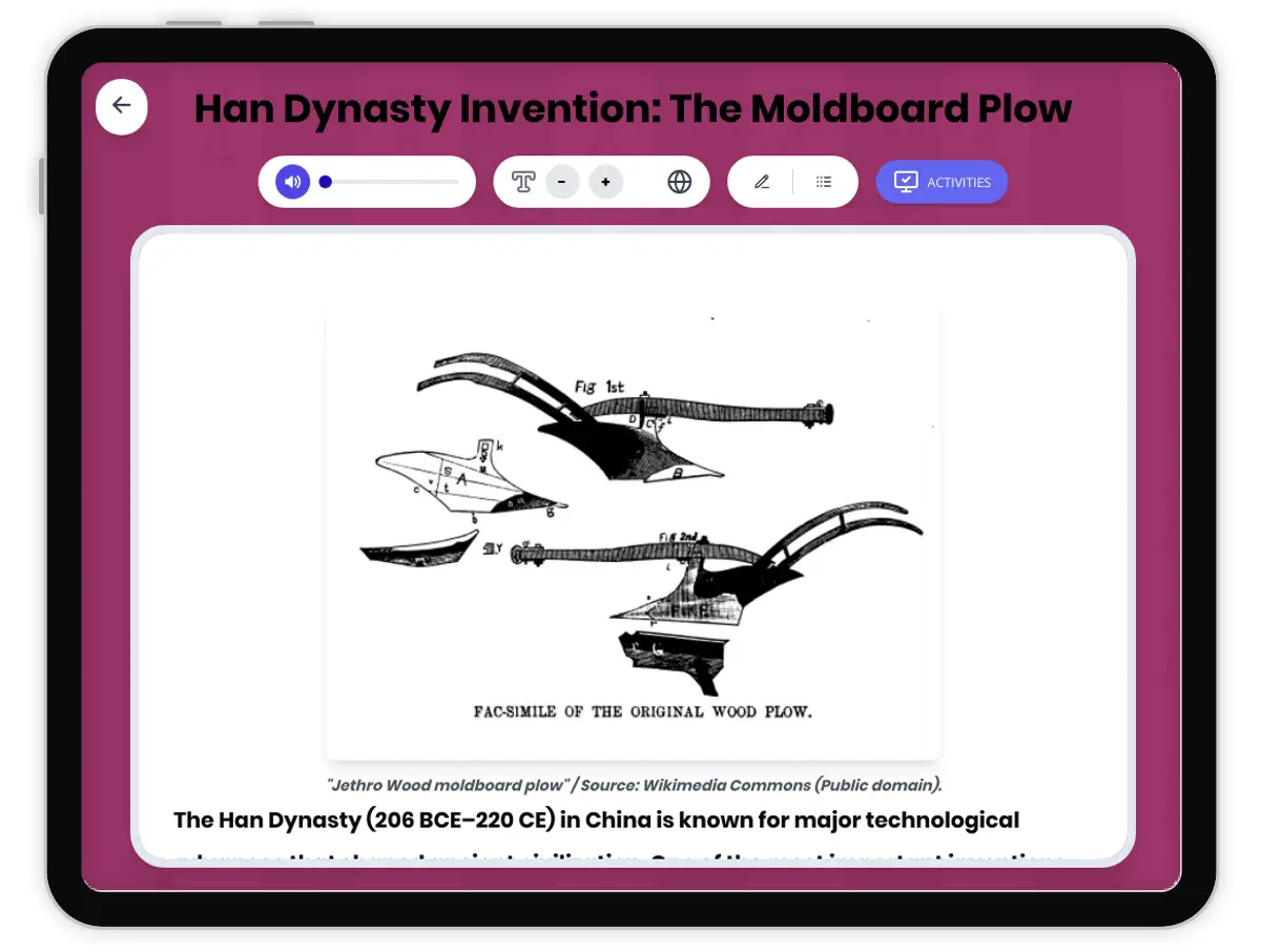 This engaging history reading passage explores the development and impact of the moldboard plow during the Han Dynasty in Ancient China. Students will discover how this important invention transformed agricultural practices, supported population growth, and influenced social structure. The passage provides historical context, primary source examples, and explains the moldboard plow’s technological significance. Activities include a multiple-choice quiz, writing prompts, graphic organizers, and a timeline to help students analyze cause-and-effect in world history. The resource features a read aloud audio and a complete Spanish translation, supporting diverse learners. This lesson aligns with CA HSS 6.6.4 and CCSS ELA-Literacy RH.6-8.1, fostering close reading, evidence-based reasoning, and historical thinking skills. Ideal for world and ancient history units on technology and innovation.
