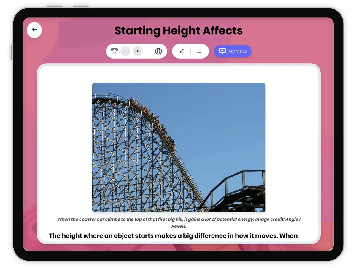 This engaging science passage aligns with NGSS standard 4-PS3-1 and helps Grade 4-5 students understand how starting height affects potential energy and kinetic energy. Through clear explanations and relatable examples, students discover why objects dropped from higher positions gain more speed as they fall to the ground. The passage connects scientific concepts to real-world applications like roller coasters, explaining why these rides start with big hills to provide energy for the entire journey. Audio-integrated features support diverse learners by providing multiple ways to access the content. Students explore the relationship between height, stored energy, and motion through concrete analogies and everyday examples. The material includes differentiated versions, Spanish translations, comprehension activities, and graphic organizers to support various learning styles and language needs.