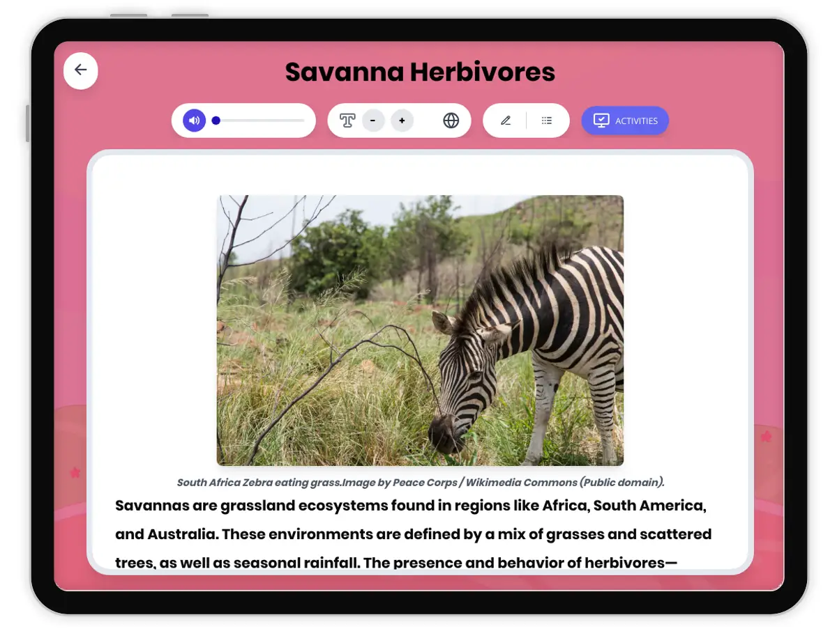 This engaging middle school science passage focuses on savanna herbivores and their role in maintaining the balance of grassland ecosystems. Designed for grades 6-8, the passage aligns to NGSS standards such as MS-LS2-1, MS-LS2-2, and MS-LS2-3, addressing ecosystem dynamics, energy flow, and species interactions. Students will learn how animals like elephants, zebras, and antelopes interact with plants, predators, and the environment to create complex food webs and influence biodiversity. The passage integrates scientific thinking, cause-and-effect analysis, and real-world environmental concerns, with activities such as quizzes, writing prompts, and graphic organizers to reinforce understanding. Glossary terms help build academic vocabulary, and the resource includes audio integration for accessibility. This comprehensive, standards-aligned lesson is ideal for developing scientific literacy and critical thinking about ecosystems and the importance of herbivores in the savanna.