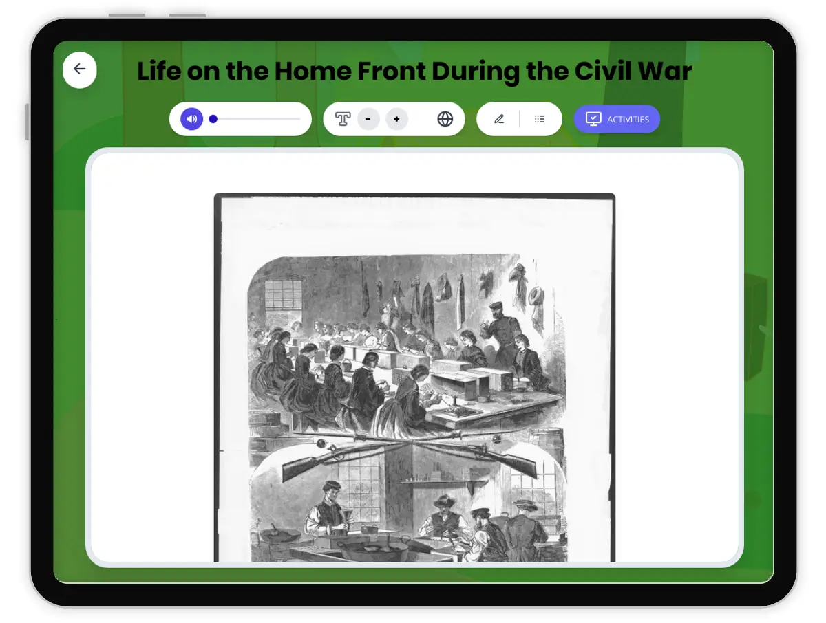 This engaging U.S. history reading passage explores daily life on the home front during the Civil War, focusing on how civilians in both the North and South faced hardships, shortages, and loss. Students will analyze the causes and effects of war on ordinary people, compare experiences across regions, and interpret primary source evidence. The passage is accompanied by a glossary of academic vocabulary, differentiated and Spanish versions, and reading comprehension activities that support critical thinking. Graphic organizers and timelines help students organize cause and effect relationships and chronological developments. This resource aligns with California HSS 8.10 and Common Core RI.6.3, W.6.2, supporting the development of historical reasoning skills. It also includes a read aloud audio feature and Spanish translation, making it accessible to a wide range of learners, including English language learners. Ideal for classroom instruction or independent study, this resource challenges students to analyze history like historians while developing key literacy skills.