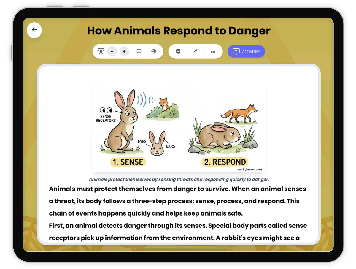 This engaging 250-word reading passage introduces fourth-grade students to the sense-process-respond chain in animals, aligned with NGSS 4-LS1-2 and the Disciplinary Core Idea LS1.D. Students discover how animals detect threats through their senses—seeing predators, hearing loud noises, or smelling smoke. The passage explains how sense receptors respond to different inputs and transmit signals along nerve cells to the brain, which then directs the body's response. Through accessible examples like rabbits freezing, skunks releasing odor, and opossums playing dead, students understand that different animals have different responses to the same type of threat. The audio-integrated content uses simple sentences and everyday vocabulary appropriate for fourth-grade reading levels. Key terms like sense receptors, nerve cells, and predators are bolded and defined in context. Students engage with multiple-choice questions testing recall and comprehension, writing activities requiring explanation and application, and graphic organizers that help them visualize the input-process-output sequence of animal danger responses. This comprehensive resource builds foundational understanding of how sensory information travels through the nervous system to produce behavioral responses, preparing students for hands-on investigations and deeper discussions about animal adaptations and survival strategies.