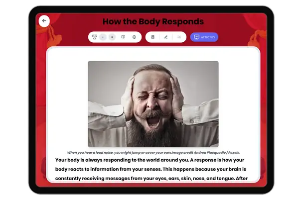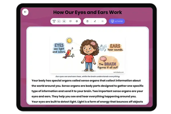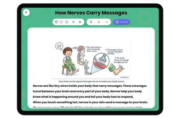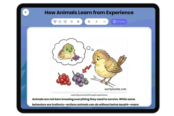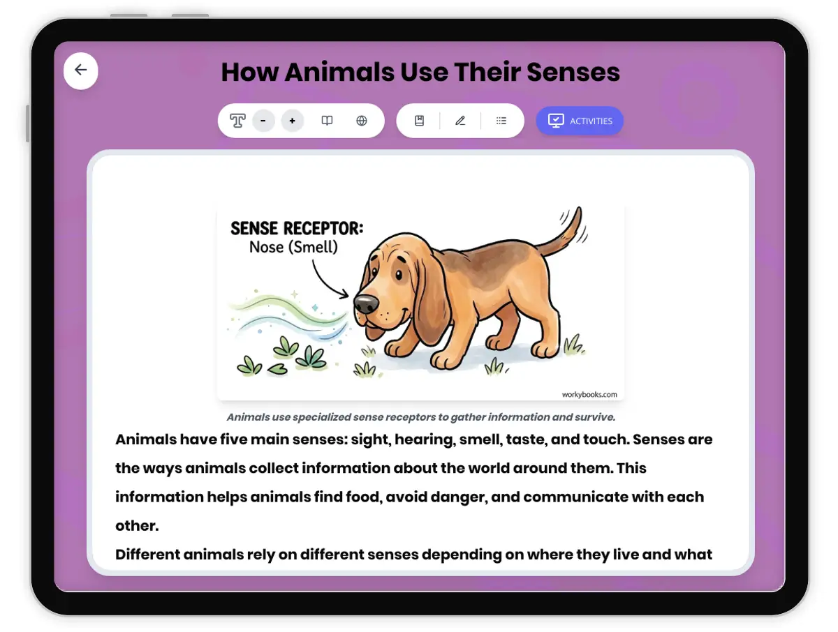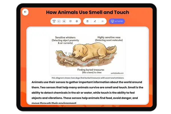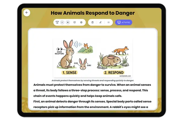 This Grade 4 science reading passage introduces students to how animals use their senses to receive information about their environment. Aligned with NGSS 4-LS1-2 and the Disciplinary Core Idea LS1.D, the passage explains that different sense receptors are specialized for particular kinds of information. Students learn that animals like dogs rely heavily on smell, eagles depend on sharp vision, and bats use hearing to navigate. The passage establishes the sense-process-respond model, helping students understand that senses are the first step in how animals interact with the world around them. This audio-integrated resource includes a simplified differentiated version, Spanish translations, vocabulary glossary, multiple-choice questions, writing activities, and graphic organizers. The content uses age-appropriate language and real-world examples to build foundational understanding of how different animals rely on different senses depending on their needs and habitat.