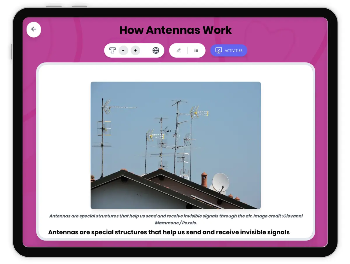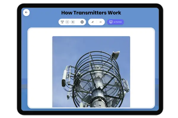 This engaging 350-word science passage introduces elementary students to the fascinating world of antennas and signal transmission. Aligned with NGSS standard 4-PS4-3, the passage explains how antennas function as structures that help transmitters send signals farther and enable receivers to detect signals more effectively. Students discover why antennas come in different shapes and sizes depending on the type of waves they handle. Real-world connections include car radio antennas receiving radio signals and large cell phone tower antennas providing stronger signals for mobile devices. The content features audio integration for enhanced accessibility, bold key vocabulary terms with immediate definitions, and concrete analogies that connect scientific concepts to familiar experiences. Supporting activities include multiple-choice comprehension questions, writing prompts, and graphic organizers that reinforce understanding of antenna structure, function, and signal transmission concepts essential for fourth and fifth-grade science learning.