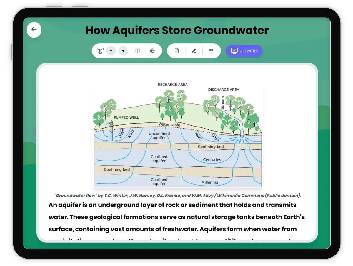 This comprehensive reading passage explores how aquifers store groundwater, aligned with NGSS standard MS-ESS2-4. Students in grades 6-8 will discover how underground rock layers function as natural water storage systems through the geological properties of porosity and permeability. The passage defines aquifers as water-bearing rock layers and explains the conditions necessary for their formation. Through clear explanations and real-world examples, students learn how spaces between rock particles allow water storage and movement. The content connects aquifer formation to Earth's broader groundwater system, emphasizing their role as critical freshwater reservoirs. Audio-integrated features support diverse learners, while differentiated versions ensure accessibility for all students. Accompanying activities include comprehension questions, writing prompts, and graphic organizers that reinforce understanding of these essential Earth surface processes and water cycle components.